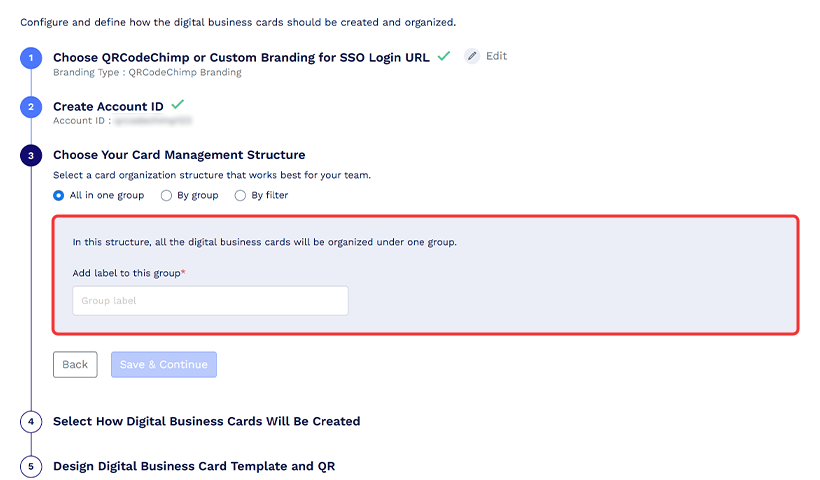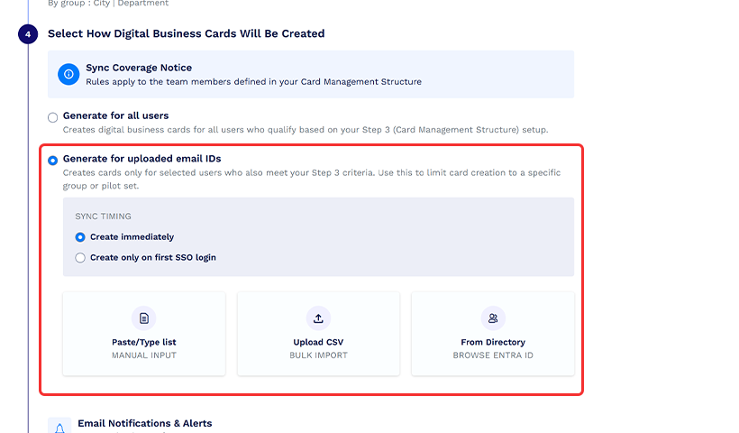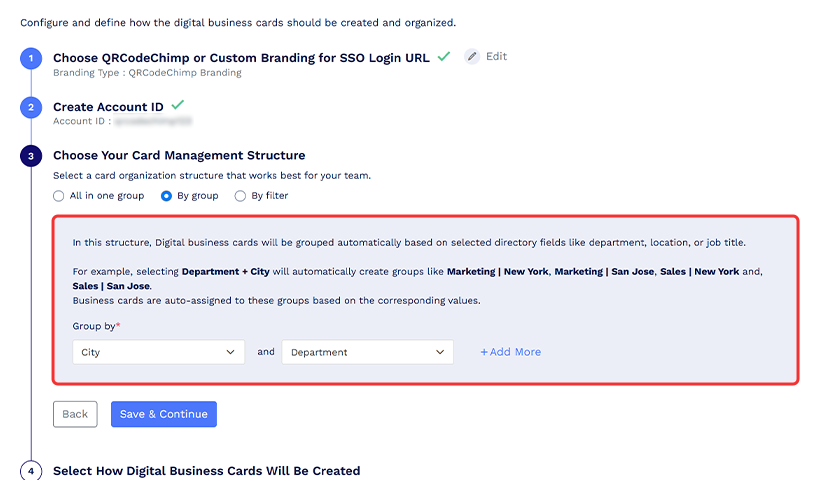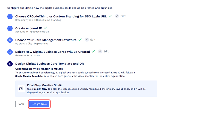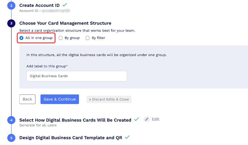Seuraavaksi on määritysvaihe. Määritä organisaatiosi digitaalisten käyntikorttien luonti- ja järjestelyasetukset noudattamalla alla olevia ohjeita.