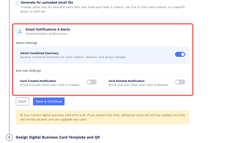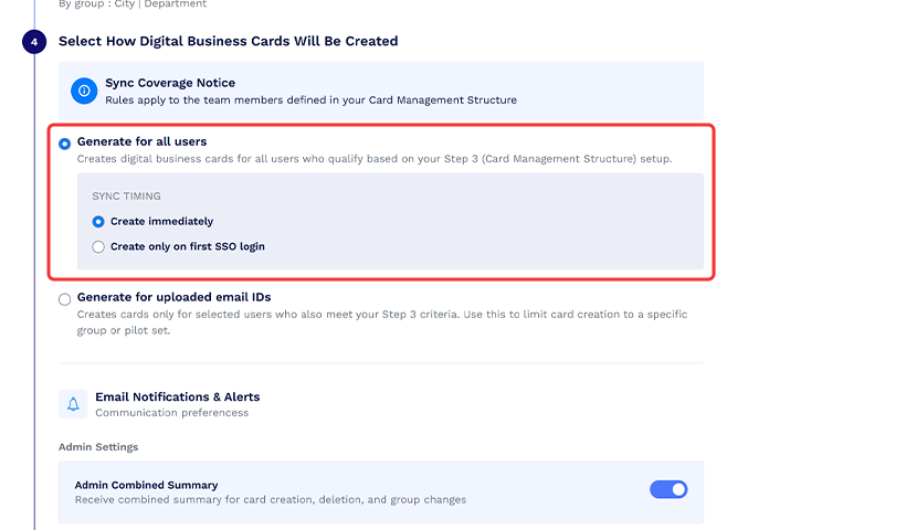 Ylläpitäjät voivat saada yhdistetyn yhteenvedon korttien luomisesta, poistamisesta ja ryhmämuutoksista valitsemalla sinisen painikkeen kohdassa "Ylläpitäjän asetukset". Loppukäyttäjät voivat saada ilmoituksen, kun heidän korttinsa luodaan ja/tai poistetaan, ottamalla käyttöön vastaavat vaihtopainikkeet.