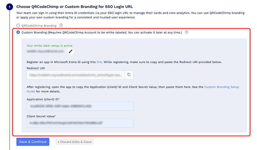 - Kun olet määrittänyt white label -ominaisuudet, luo sovellus Entra ID:ssä ja yhdistä se QRCodeChimpSinun täytyy kopioida Sovelluksen (asiakas) tunnus ja Asiakkaan salainen arvo sovelluksesta ja liitä ne sitten niille tarkoitettuihin kenttiin QRCodeChimp.