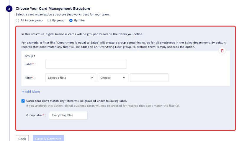 Esimerkiksi suodatin, kuten "Osasto on yhtä suuri kuin myynti", luo ryhmän, joka sisältää kortit kaikille myyntiosaston työntekijöille. Oletusarvoisesti tietueet, jotka eivät vastaa mitään suodatinta, lisätään "Kaikki muu" -ryhmään. Voit sulkea ne pois poistamalla valinnan. Jos teet niin, digitaalisia käyntikortteja ei luoda tietueille, jotka eivät täytä suodatuskriteerejä.