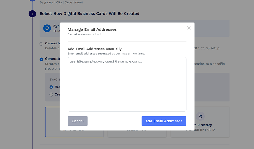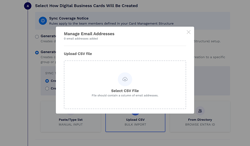 Jos haluat luoda digitaalisia käyntikortteja vain ladatuille sähköpostiosoitteille, voit joko "Liitä/kirjoita lista", "Lähetä CSV" tai noutaa ne "Hakemistosta". Saat kummallekin menetelmälle ponnahdusikkunan, joka vastaa valitsemaasi menetelmää. Jos käytät Active Directorya, käyttäjäluettelo heijastaa vaiheessa 3 (Korttinhallintarakenteenne) määriteltyjä ryhmittelykriteerejä, jolloin voit valita tarkalleen, mille käyttäjille kortit halutaan.