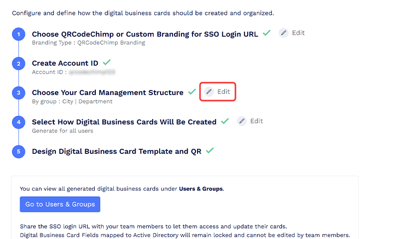 Siirry omaan QRCodeChimp Siirry kohtaan "Muokkaa" tai napsauta sen vaiheen vieressä olevaa kynäkuvaketta, jota haluat muokata (esimerkiksi "Kortinhallinnan rakenne").