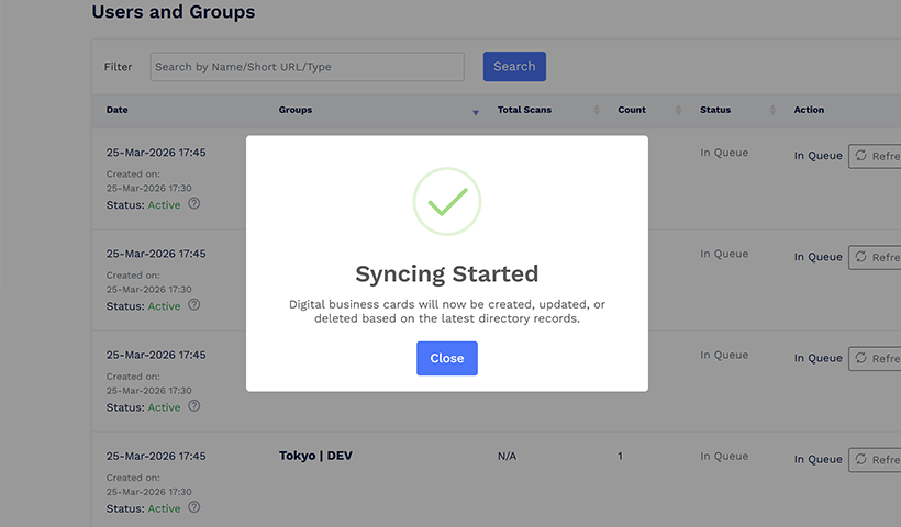 Entra ID:n muutokset näkyvät välittömästi käyntikorteissa. Jos se ei toimi, siirry kojelaudasta Käyttäjät ja ryhmät -osioon ja napsauta Synkronoi nyt painiketta.